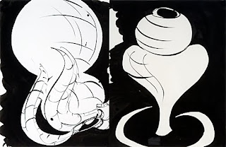 The ink drawings are flights of fancy that spin off my ceramic pieces - portrayals of vessels unfettered by the physics of gravity, ceramic engineering, and the limits of the medium of fired clay. The drawn images move in other trajectories; they can float in midair, split in half, turn somersaults, and morph into organic entities. These drawings reflect the intuitive elegance of decisions made rapidly and offhandedly. The approach here differs radically from that of making a three-dimensional object which must somehow survive the complex, time consuming, and demanding process of construction and firing.